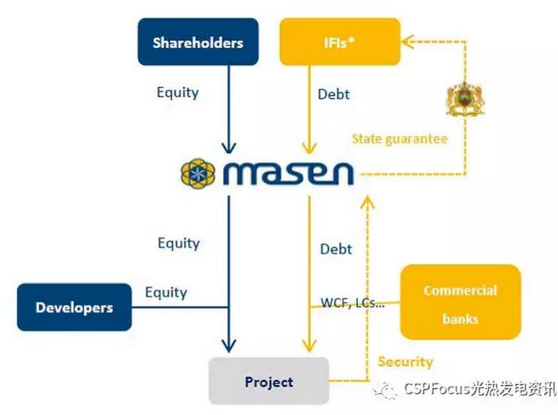 NOORo系列三个光热电站都采取了政府资本股权+国际金融机构联合贷款模式。其中摩洛哥可再生能源署(MASEN)作为政府执行可再生能源的重要机构,占有电站25%的股权,而项目贷款则由政府担保,多个国家的国际金融机构提供贷款支持。