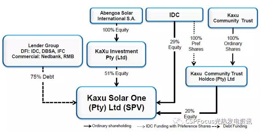 南非光热电站融资模式和国际上其他地区类似,但有更多本地化的要求。项目开发商(如Abengoa),南非本地大型国企(如南非工业发展公司IDC)以及当地社区信托(如IDC出资的Khi Community Trust和Kaxu Community Trust)都会参与到项目股权中。