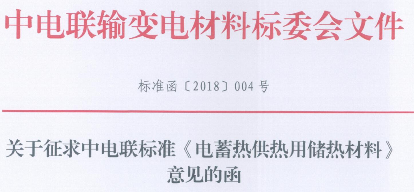 10月31日,由中国电力企业联合会(简称中电联)输变电材料标准化技术委员会归口、全球能源互联网研究院有限公司牵头编制的中电联团体标准《电蓄热供热用储热材料》完成征求意见稿并启动意见征求程序,要求各相关单位于11月30日前将意见反馈至标准编制组。
