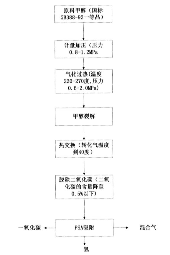 液体原料甲醇经加压计量泵加压后,进入使用导热油供热的气化过热器中进行升温和气化,使甲醇气体升温至220˚C~270˚C后引入催化反应器进行裂解反应,得到一氧化碳、氢气、二氧化碳以及未转化的部分甲醇混合转化气,再经热交换器冷凝、脱除二氧化碳以及PSA吸附流程后,可通过调节装置运行情况得到不同纯度的氢气。