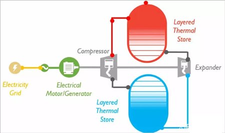 该示范项目包含首个150kw热泵连接电网,并使用创新的可逆热泵发动机,将电能转换为热能。该系统利用来自电网的多余电能驱动热泵,将电能转化为热能。在热侧,氩气被压缩后升温到500℃,而后通过含有岩石储能材料的空间,并将其能量释放到储能材料中;在冷端,氩气膨胀后降温到-160℃,同样通过储能材料后将能量释放到储能材料。如此,设施两端分别可得到“热岩石电池”和一个“低温冷电池”,两者都能将能量储存长达8小时。释放岩石储能材料中的能量时,氩气向相反的方向流动用来发电并返回电网。