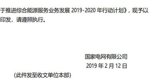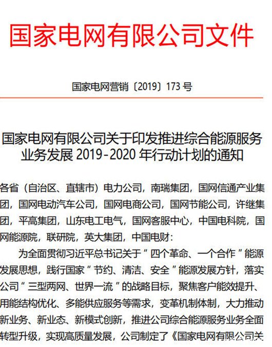 能见App消息,近日国家电网有限公司正式印发《推进综合能源服务业务发展2019-2020年行动计划》。根据《行动计划》,国家电网未来两年将紧紧抓住新一轮能源技术革命、信息通讯技术革命和产业融合发展的新机遇,践行公司“三型两网、世界一流”战略目标,坚持以电为中心、多能互济,以推进能源互联网、智慧用能为发展方向,构建开放、合作、共赢的能源服务平台,将公司建设成为综合能源服务领域主要践行者、深度参与者、重要推动者和示范引领者。