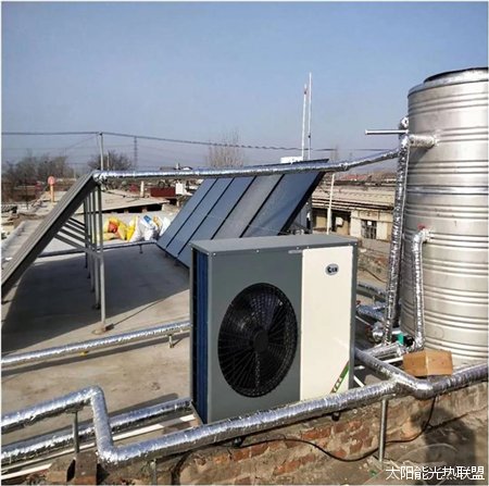 (注:该项目采用高效平板太阳能集热器系统+空气源热泵做辅助热源+储热水箱的系统配置。在全自动控制仪的控制下,有阳光时,系统自动启动太阳能集热系统集热、供热、储热,实现太阳能采暖。当阳光不足或无阳光时,热泵自动运行,及时补充太阳能不足缺失的热量,确保采暖系统以最经济的方式正常运行。)