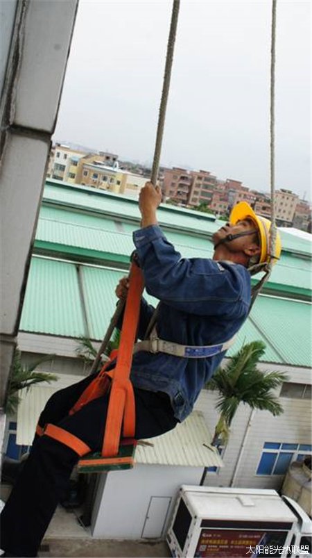 安装实操技能在五星太阳能办公楼顶太阳能实验室进行,讲解员现场讲解了施工安全防护措施及注意事项,并组织参训人员实践操作了吊人安装的方法和操作注意事项。由于参训人员较多,为让每个人都能参与实践操作,现场按组分批进行了实践操作,学习了吊绳系法、安全防护衣的正确用法,体验了高空吊人安装实践操作。
