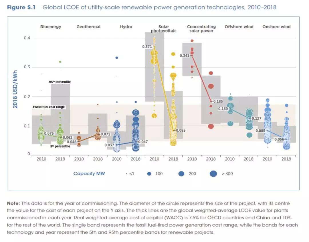 图:全球规模化可再生能源发电技术LCOE,2010-2018