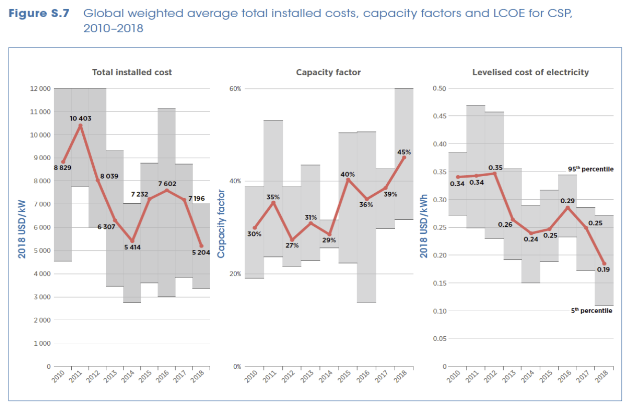 图S.7表示,2018年CSP单位投资成本5204美元/千瓦,比2010年(8829美元/千瓦)下降58.9%;2018年容量因子为45%,比2010年(30%)提高15个百分点;2018年LCOE19美分/千瓦时,比2010年(34美分/千瓦时)下降44.1%。
