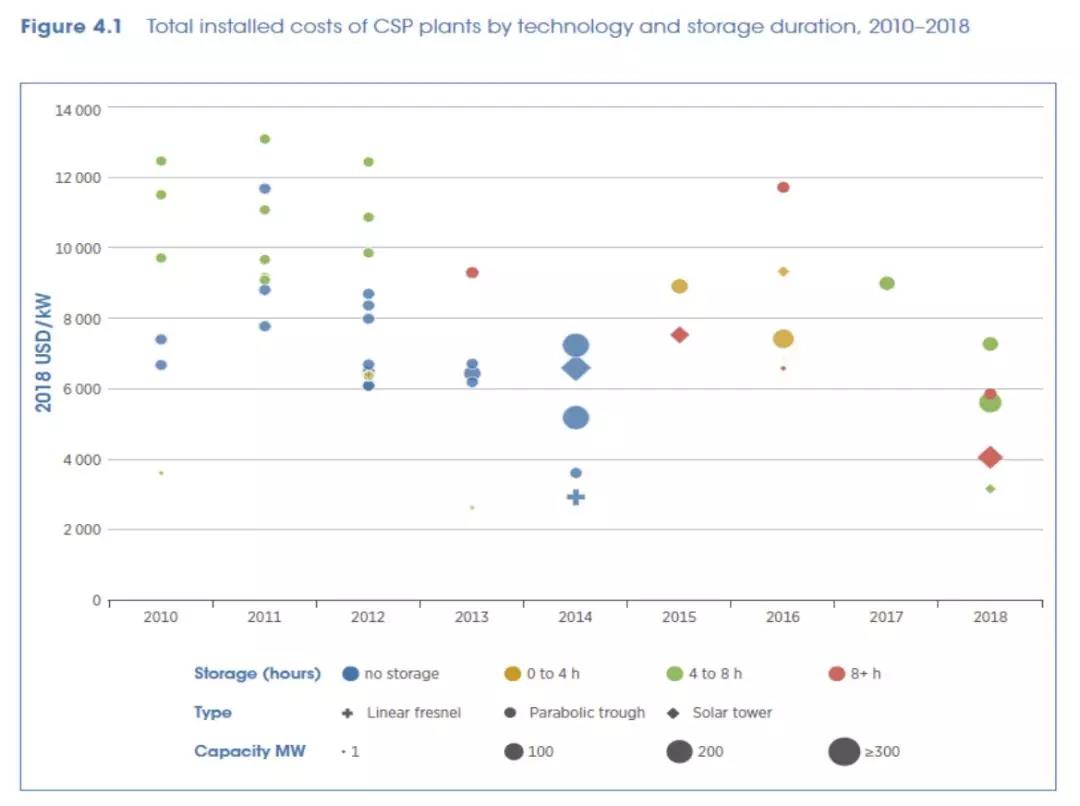 图:2010-2018年按技术和储能时长分类的CSP电站总安装成本