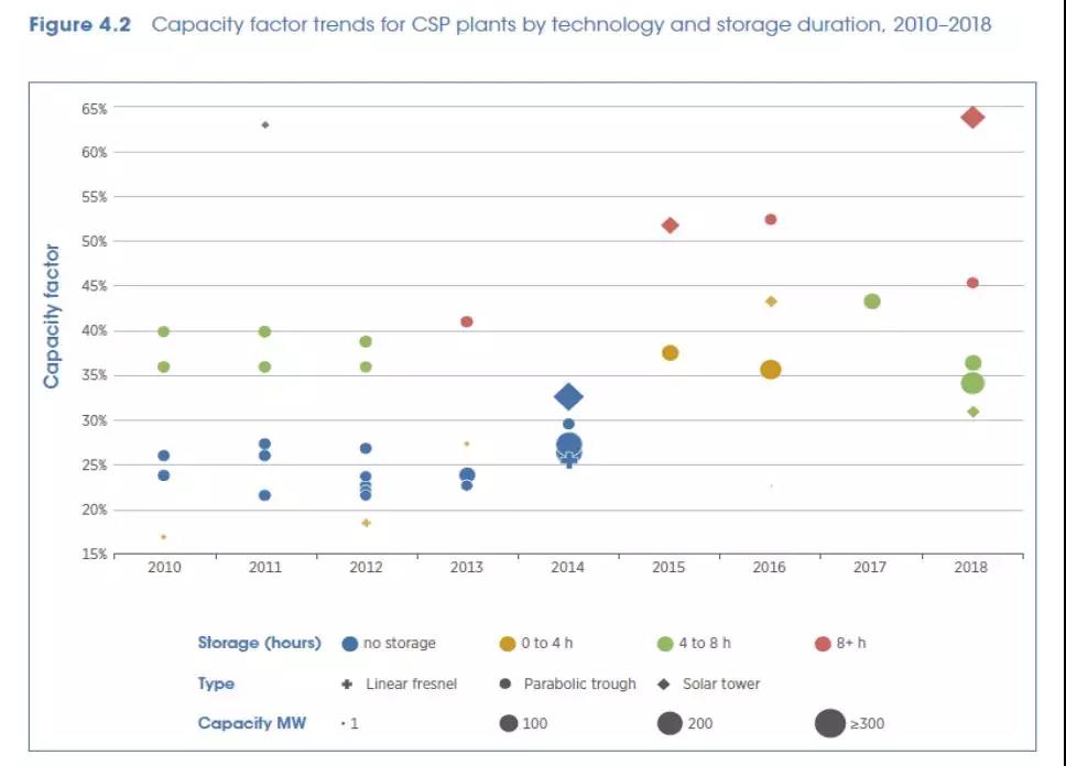 图:2010-2018年按技术和储能时长分类的CSP电站容量因子趋势