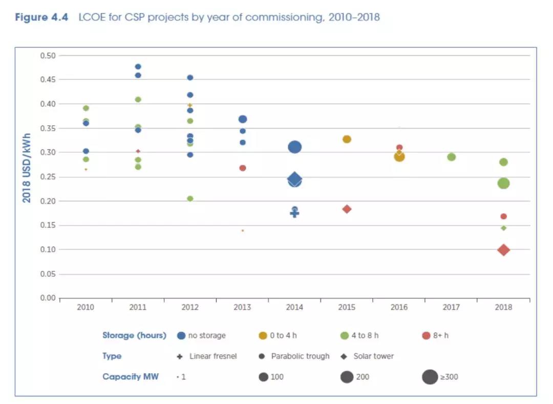 上图可以看出,储能时长高达8小时的CSP电站的投资成本从2010年至2012年间的6 100-13100美元/千瓦下降至2018年的3 200-7 300美元/千瓦(储能时长更高,4-8小时)。 自2014年以来,没有线性菲涅耳系统投运。