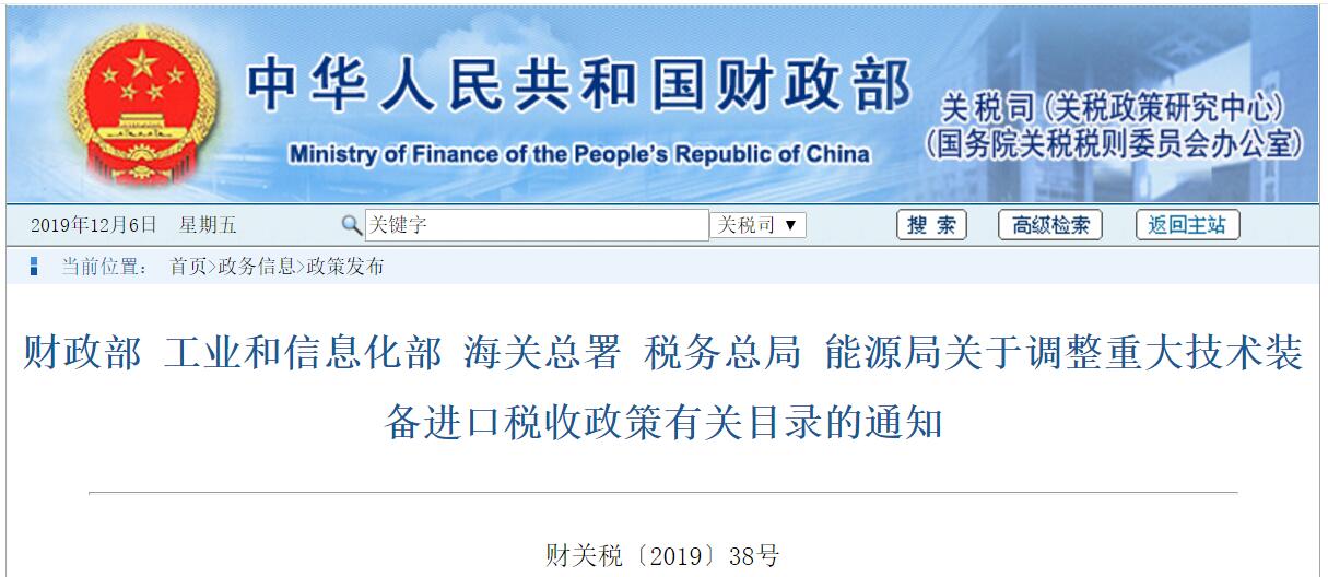 12月6日,财政部、工信部、海关总署、税务总局、国家能源局联合发布了《关于调整重大技术装备进口税收政策有关目录的通知》(财关税〔2019〕38号)。