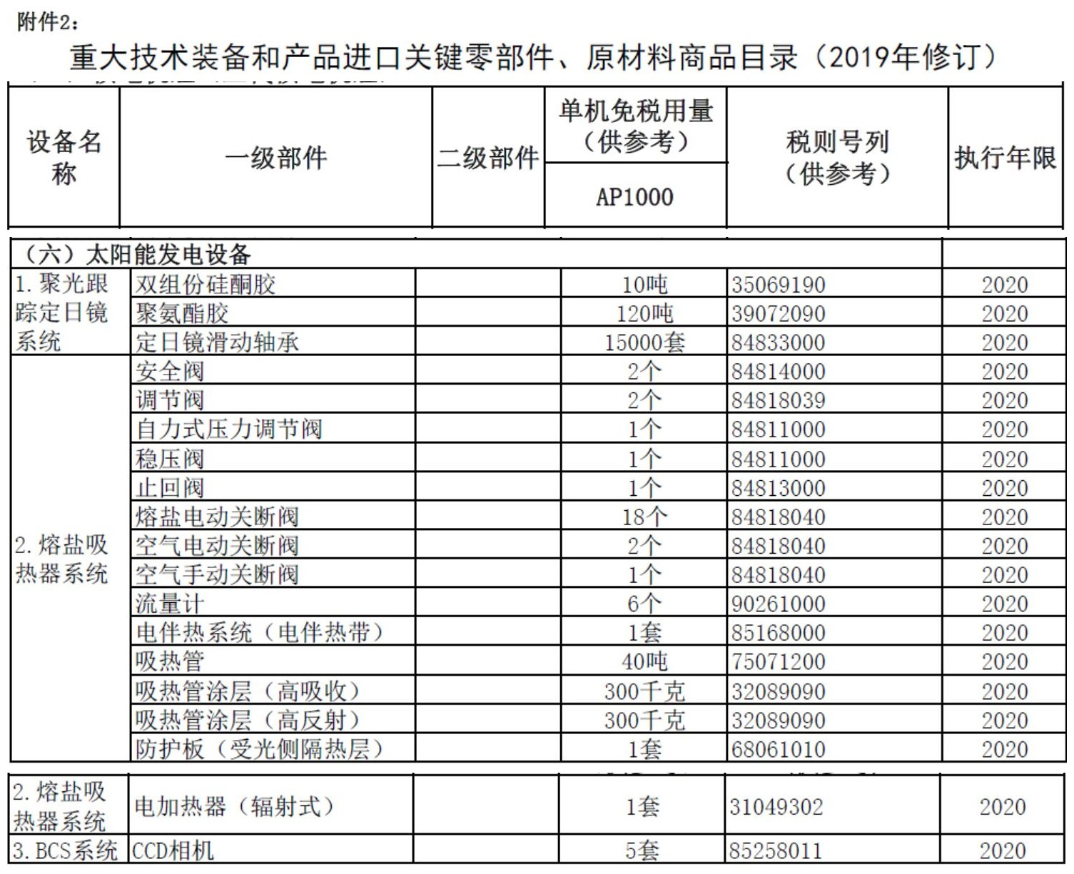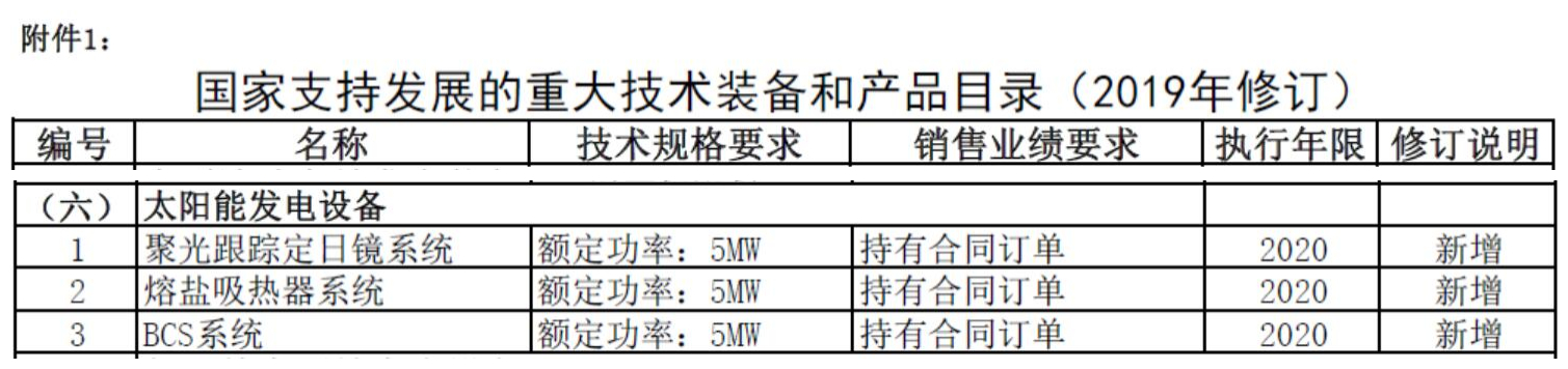 其中,聚光跟踪定日镜系统、熔盐吸热器系统以及BCS系统三大光热发电相关装备作为大型清洁高效发电装备入列《国家支持发展的重大技术装备和产品目录(2019年修订)》(详见附件1)。