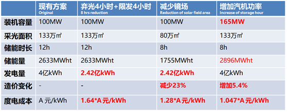 中控太阳能董事长金建祥对此作过测算,如下图所示,在中午限电4小时的情况下,通过增大汽轮机功率或延长储能时长对一个100MW的光热电站进行改造,如另外增加两个储热罐,中午弃发4小时的太阳热能通过该储罐存储,在可上网时间段内再上网。在维持年发电量不变的情况下,度电成本将带来约2%的增加。
