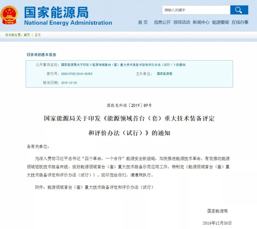 2019年12月30日,国家能源局印发《能源领域首台(套)重大技术装备评定和评价办法(试行)》的通知。