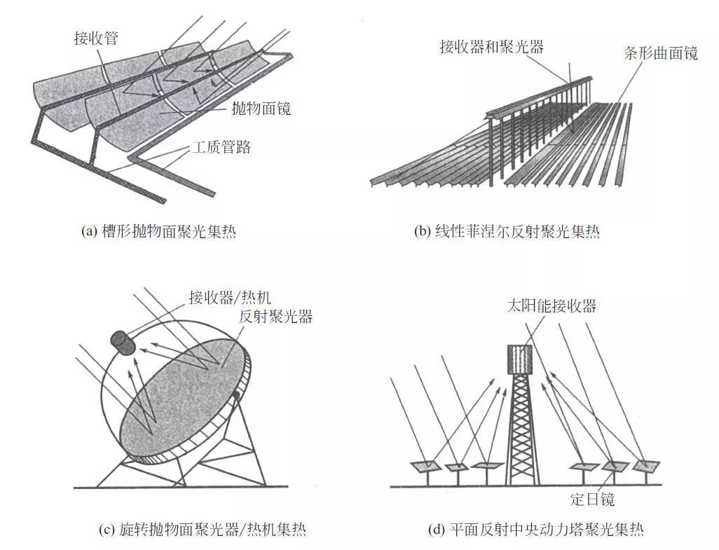 图:太阳能热动力发电采用的4种聚光集热技术原理示意