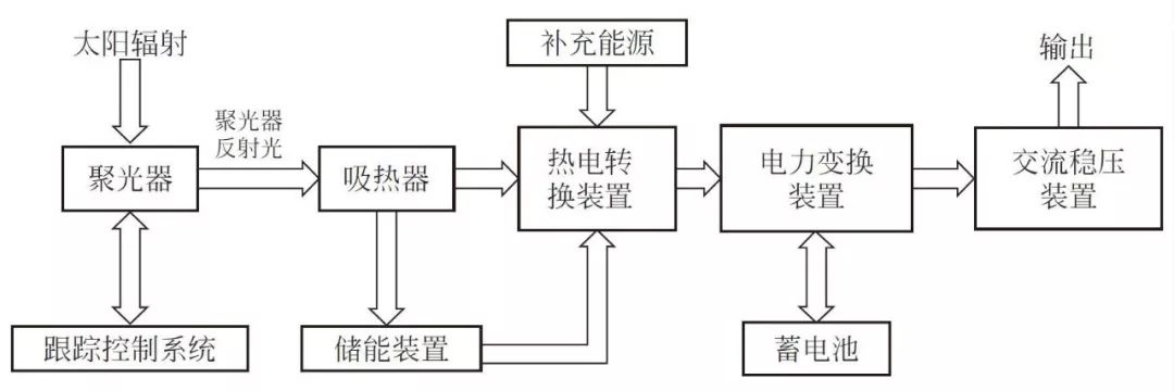 太阳能热发电是将太阳辐射经热能转换为电能的能量转换方式,其中热发电部分与常规热力发电工厂相同或相近,属广泛应用的常规设备,而提高太阳辐射的能流密度,并将其转换为不同温度的热能的部分,如聚光、跟踪、热能接收、转换和储存,是太阳能热利用的专有技术。