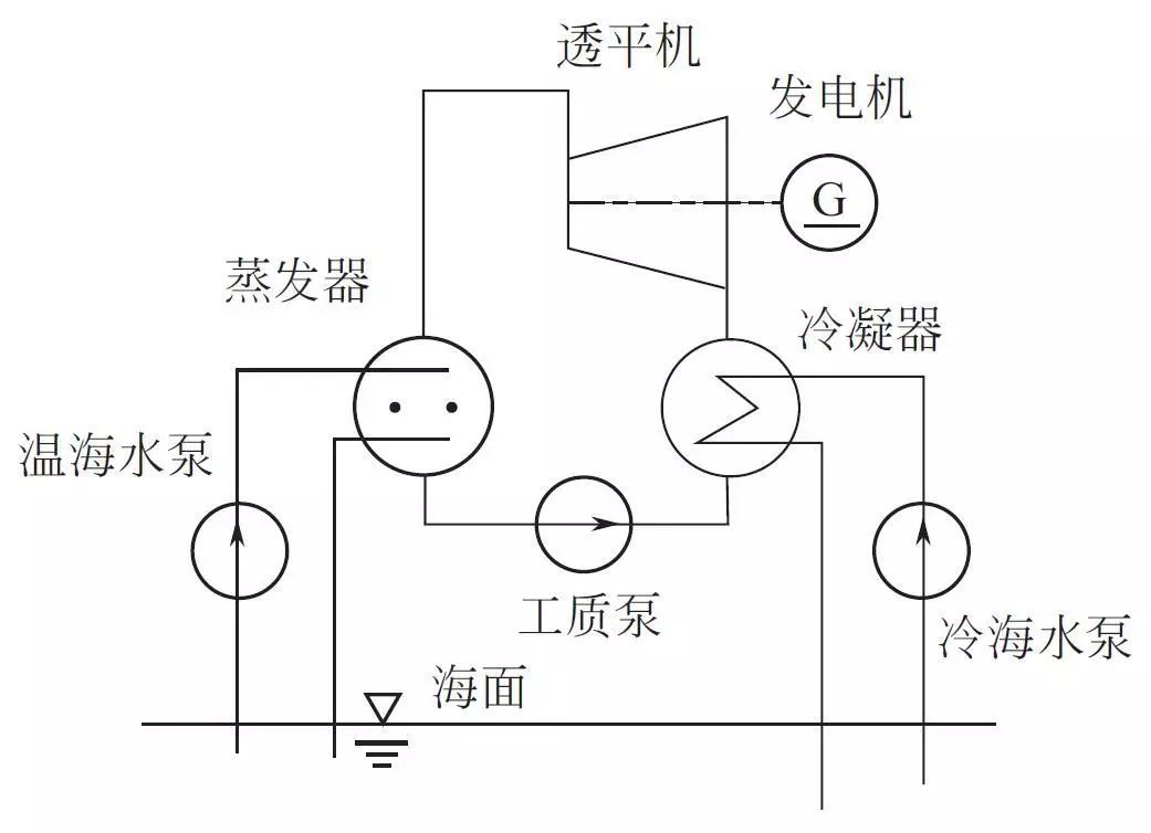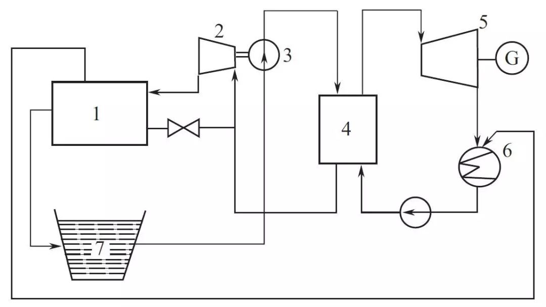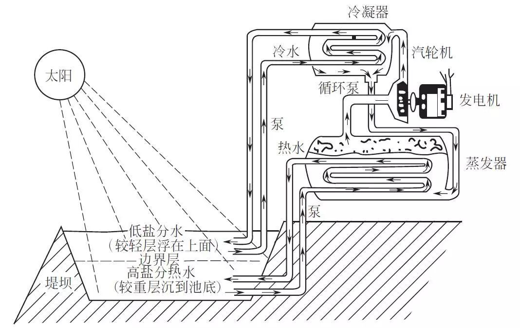 图:1—工质分离水箱;2—水轮机;3—盐水泵;4—蒸发器;5—汽轮发电机组;6—凝汽器;7—太阳池(监控系统)