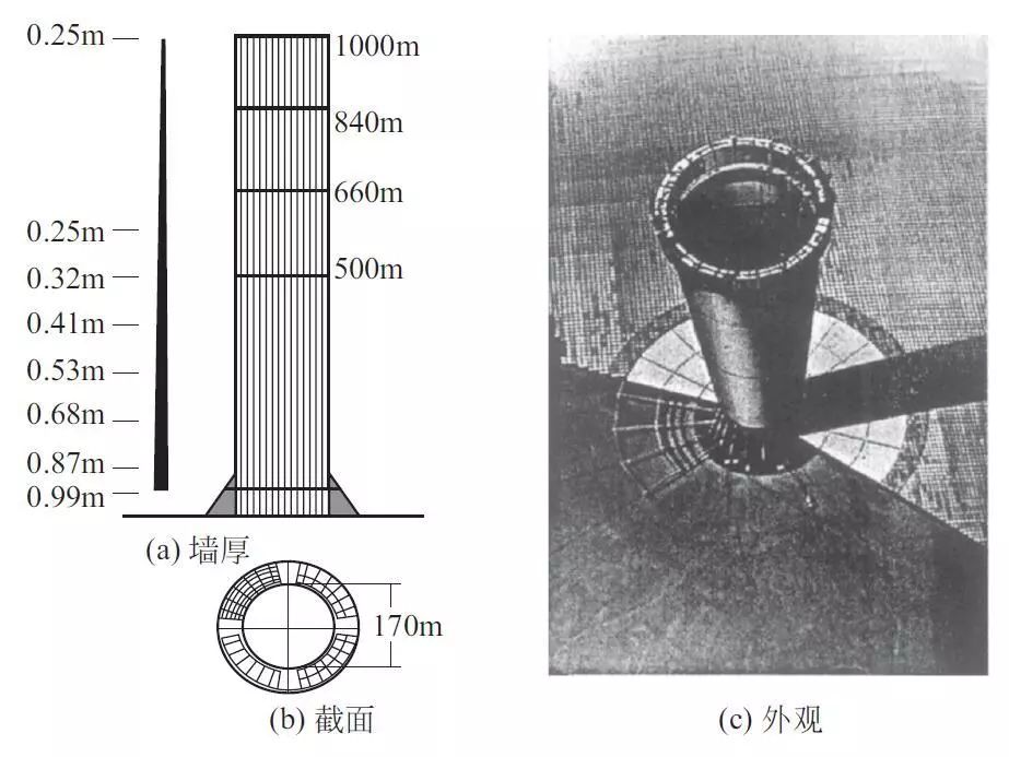 图:高1000m、直径为170m 的太阳烟囱发电站示意