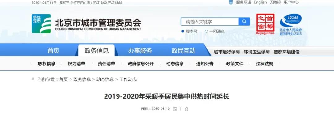 2020年3月10日,北京市城市管理委员会官网发布,经北京市委市政府研究决定:本市城镇居民集中供热结束时间顺延至3月22日24时。延长供热期内,区域锅炉房和热电联产中的居民供热,以及调整天然气分户自采暖居民用户用气量补贴上限增加的费用由北京市财政全额负担。