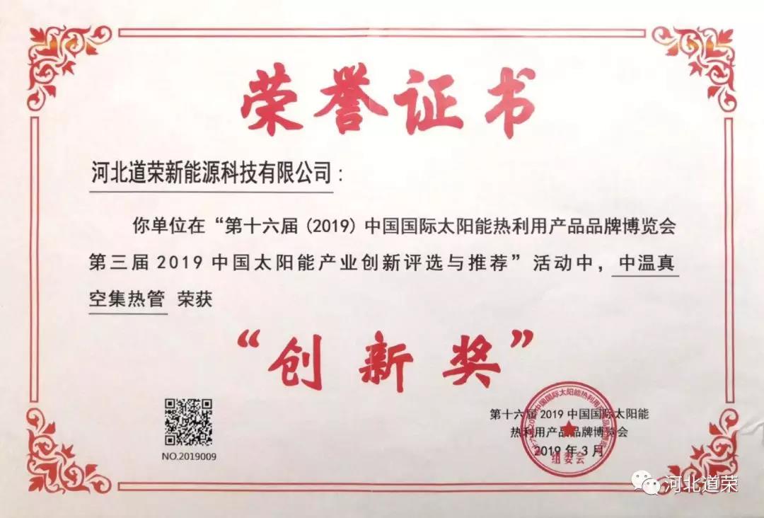 太博会期间,河北道荣通过层层选拔,荣获“第十六届(2019)中国国际太阳能热利用产品品牌博览第三届2019中国太阳能产业创新评选与推荐”活动中,中温真空集热管荣获“创新奖”。