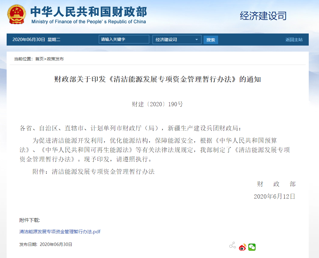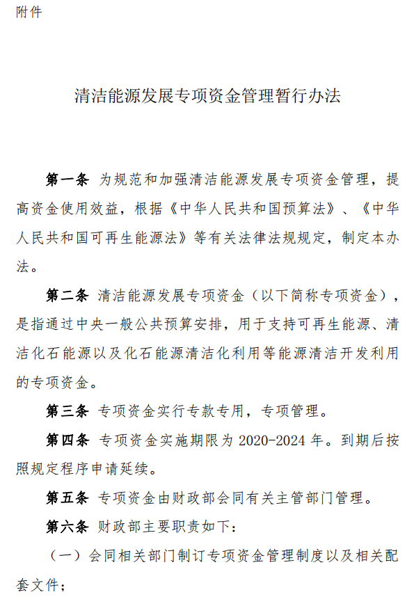 2020年6月30日,财政部官网发布了《清洁能源发展专项资金管理暂行办法》(以下简称《暂行办法》),专项资金实施期限为2020-2024年,到期后按照规定程序申请延续。