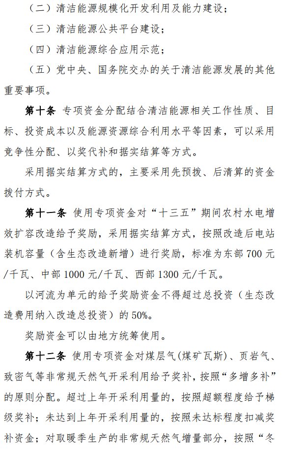 《暂行办法》指出,专项资金分配结合清洁能源相关工作性质、目标、投资成本以及能源资源综合利用水平等因素,可以采用竞争性分配、以奖代补和据实结算等方式。采用据实结算方式的,主要采用先预拨、后清算的资金拨付方式。