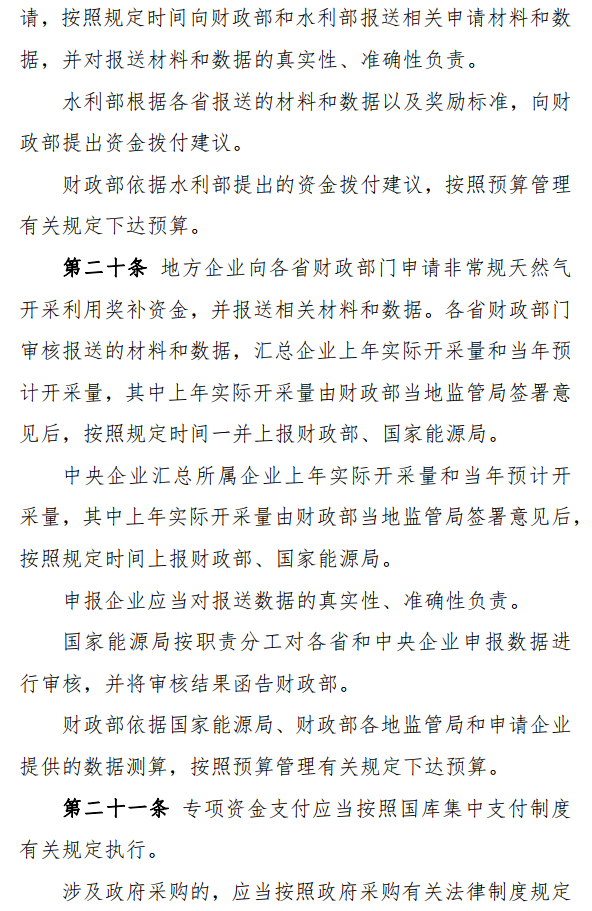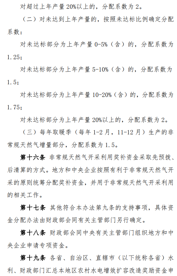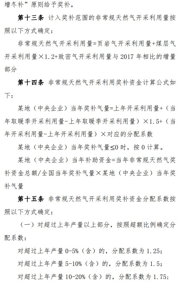 使用专项资金对煤层气(煤矿瓦斯)、页岩气、致密气等非常规天然气开采利用给予奖补,按照“多增多补”的原则分配。非常规天然气开采利用奖补资金采取先预拨、后清算的方式。