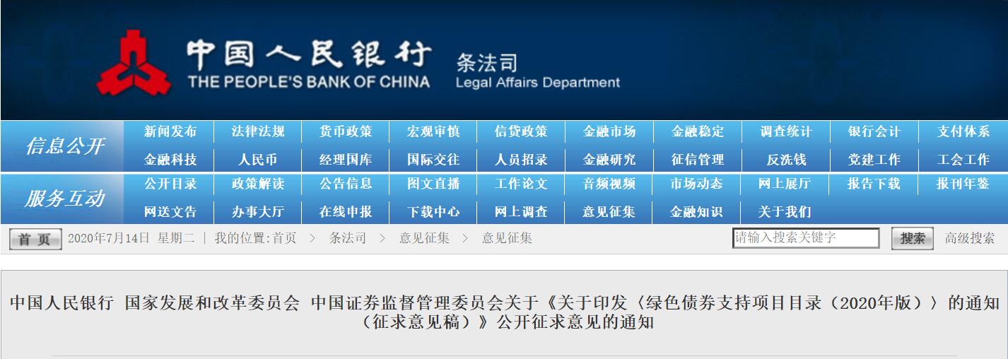7月8日,中国人民银行同国家发展和改革委员会、中国证券监督管理委员会起草了《关于印发〈绿色债券支持项目目录(2020年版)〉的通知(征求意见稿)》,并向社会公开征求意见。
