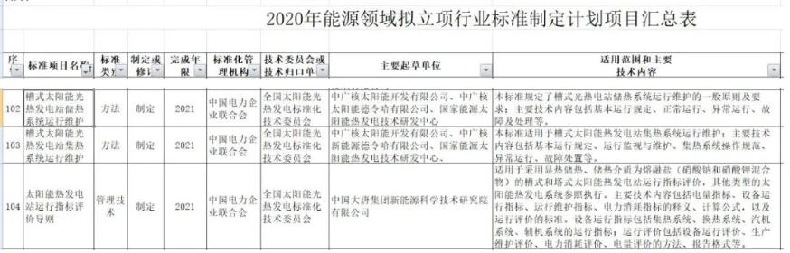 8月31日,国家能源局综合司发布《关于2020年能源领域拟立项行业标准制定计划项目征求意见的公告》,其中包括三项光热发电相关标准,分别为:《槽式太阳能光热发电站储热系统运行维护规程》、《槽式太阳能光热发电站集热系统运行维护规程》及《太阳能热发电站运行指标评价导则》。