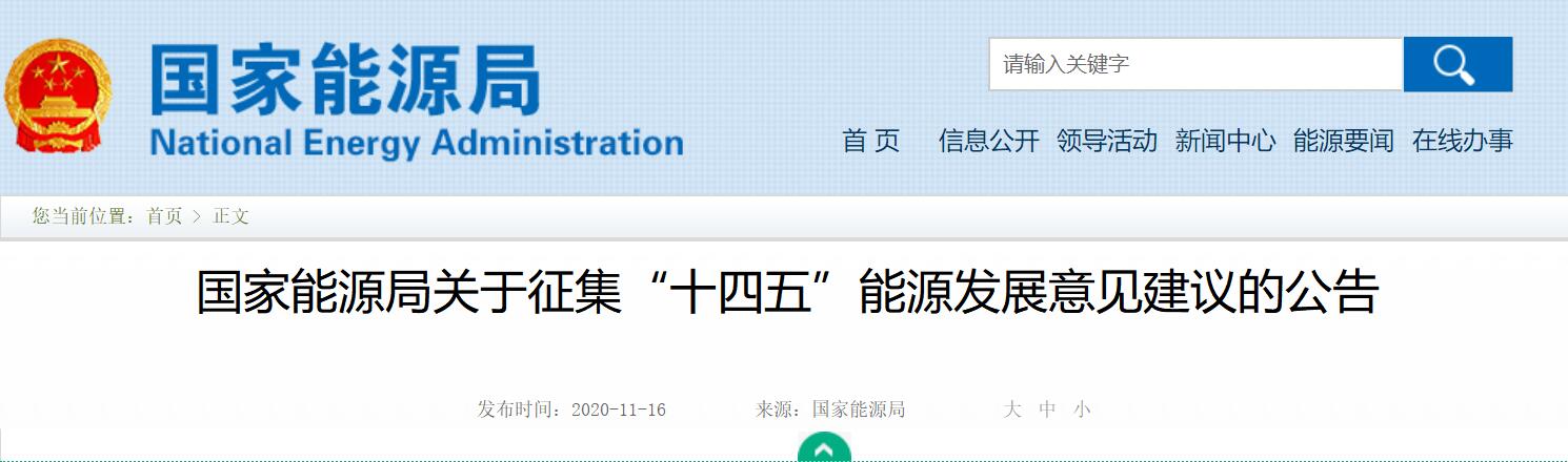 11月16日,国家能源局发布关于征集“十四五”能源发展意见建议的公告,公开征求对“十四五”能源规划研究编制工作的意见建议。