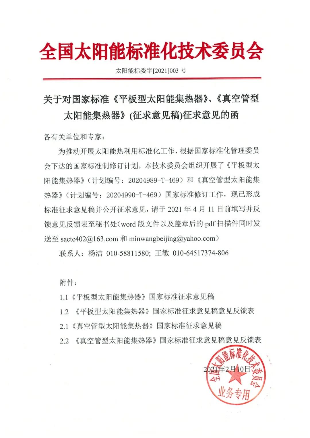 近日,全国太阳能标准化技术委员会下发“关于对国家标准《平板型太阳能集热器》、《真空管型太阳能集热器》(征求意见稿)征求意见的函”。意见截止日期为2021年4月11日。