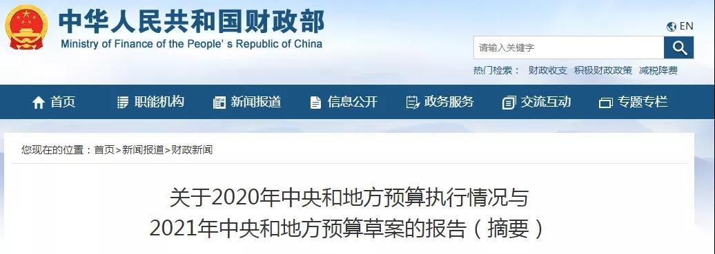 财政部3月5日提请十三届全国人大四次会议审查《关于2020年中央和地方预算执行情况与2021年中央和地方预算草案的报告》。