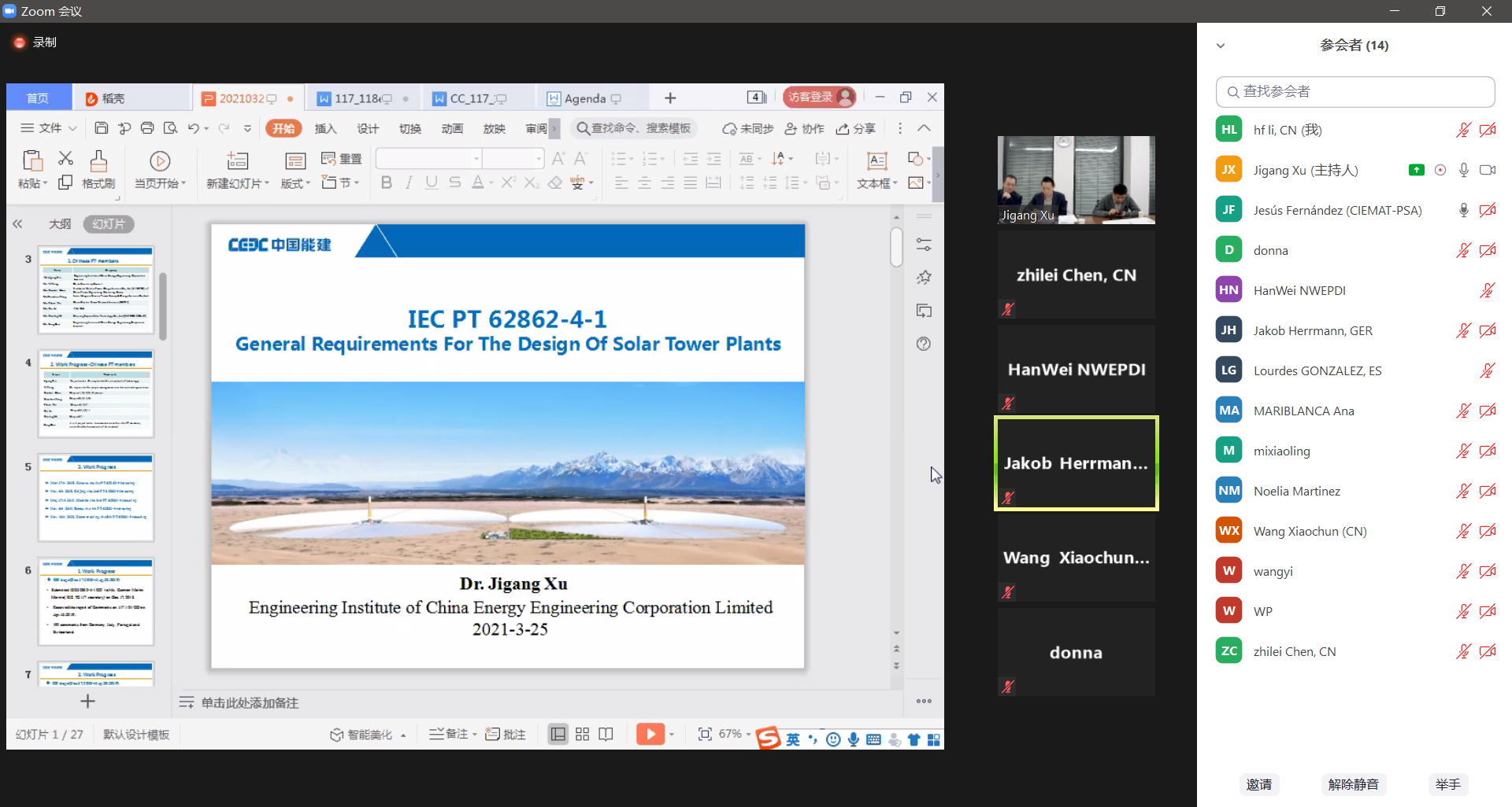 3月25日,IEC标准《塔式太阳能光热发电站设计总体要求》(PT62862-4-1)第六次工作组会议通过视频形式召开。