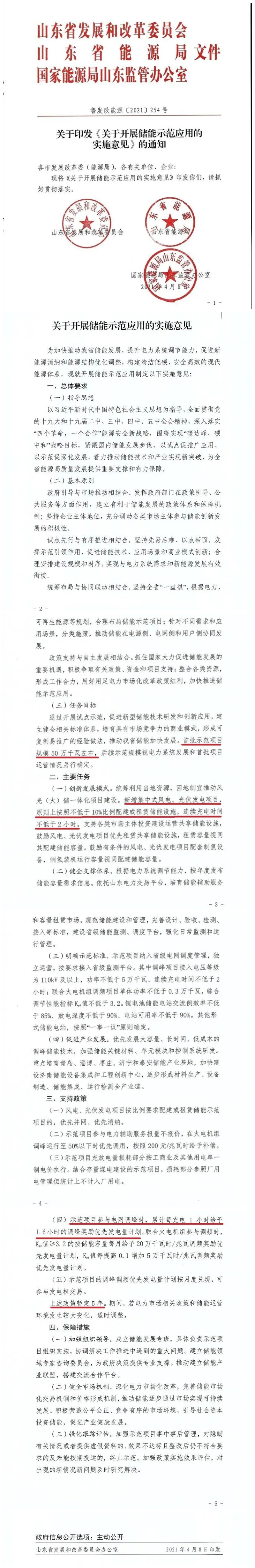 4月8日,山东省发展和改革委员会、山东省能源局、国家能源局山东监管办公室正式下发了《关于开展储能示范应用的实施意见》,首批示范项目规模约50万千瓦,政策暂定实施5年。