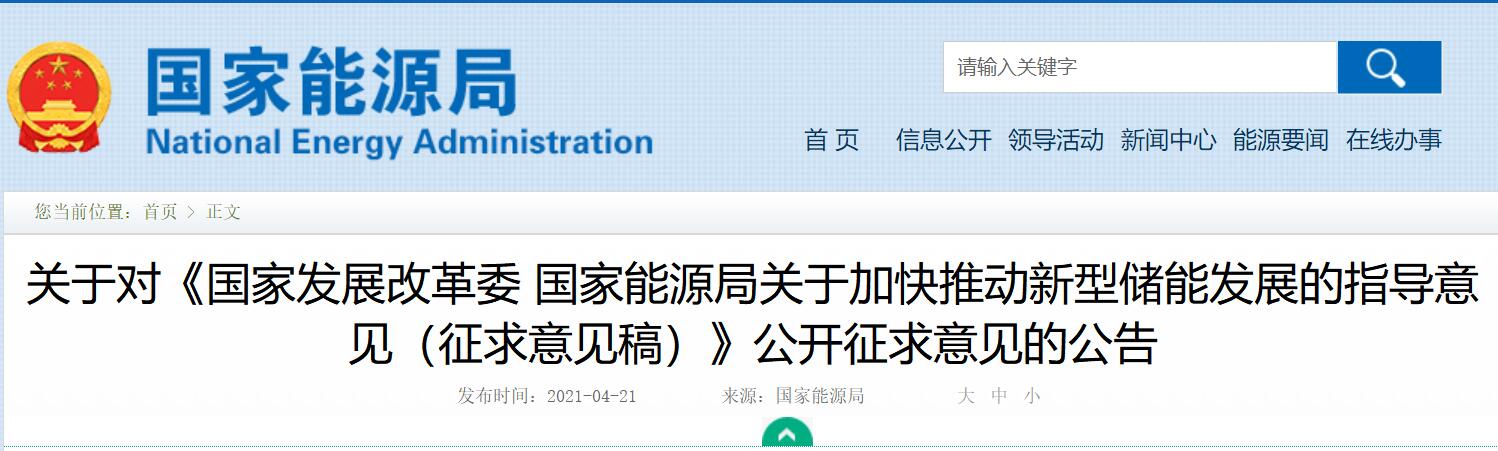 4月21日,国家发改委、国家能源局联合印发《关于加快推动新型储能发展的指导意见(征求意见稿)》。文件表示,到2025年,实现新型储能从商业化初期向规模化发展转变。新型储能技术创新能力显著提高,核心技术装备自主可控水平大幅提升,在低成本、高可靠、长寿命等方面取得长足进步,标准体系基本完善,产业体系日趋完备,市场环境和商业模式基本成熟,装机规模达3000万千瓦以上。新型储能在推动能源领域碳达峰碳中和过程中发挥显著作用。