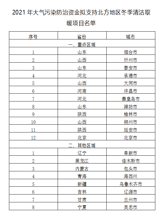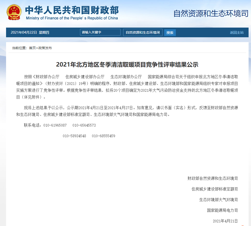2021年4月21日,财政部等四部门共同发布《2021年北方地区冬季清洁取暖项目竞争性评审结果公示》,拟将20个项目确定为2021年大气污染防治资金支持的北方地区冬季清洁取暖项目。