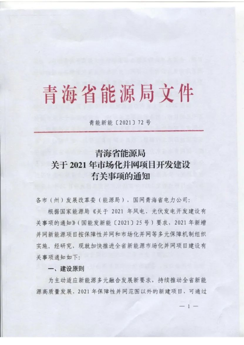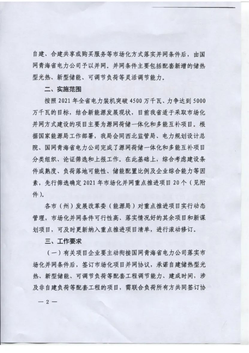 通知指出,2021年新增并网新能源项目,按保障性并网和市场化并网等多元保障机制组织实施。为主动适应新能源多元融合发展新要求,持续推动全省新能源高质量发展,2021年保障性并网范围以外的新建项目,可通过自建、合建共享或购买服务等市场化方式落实并网条件后,由国网青海省电力公司予以并网。并网条件主要包括配套新增的储热型光热、新型储能、可调节负荷等灵活调节能力。
