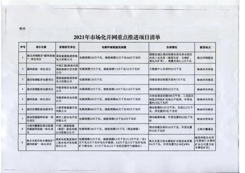 通知指出,综合考虑建设条件成熟度、负荷落地可能性、储能配置比例及企业综合能力等因素,筛选确定了2021年首批市场化并网重点推进项目20个,后续由各市发改委(能源局)对重点推进项目实施动态管理,可行性高、落实情况好的其他项目可及时更新纳入名单里,进行滚动修订。根据名单,青海省2021年重点推进20个首批市场化并网项目电源规模总计42.13GW,配备储能规模约5.2GW。