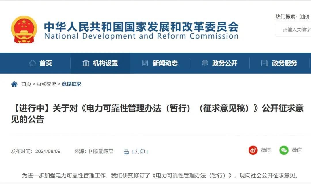 8月10日,国家发改委发布关于对《电力可靠性管理办法(暂行)(征求意见稿)》公开征求意见的公告,征求意见截止时间为2021年9月8日。