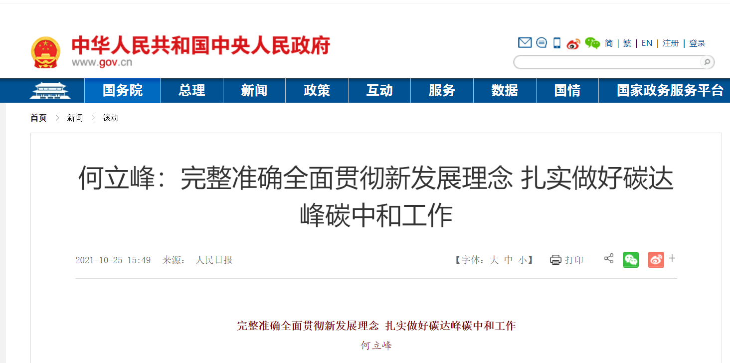 10月24日,《中共中央 国务院关于完整准确全面贯彻新发展理念做好碳达峰碳中和工作的意见》发布,对碳达峰碳中和工作作出系统谋划,明确了总体要求、主要目标和重大举措,是指导做好碳达峰碳中和这项重大工作的纲领性文件。