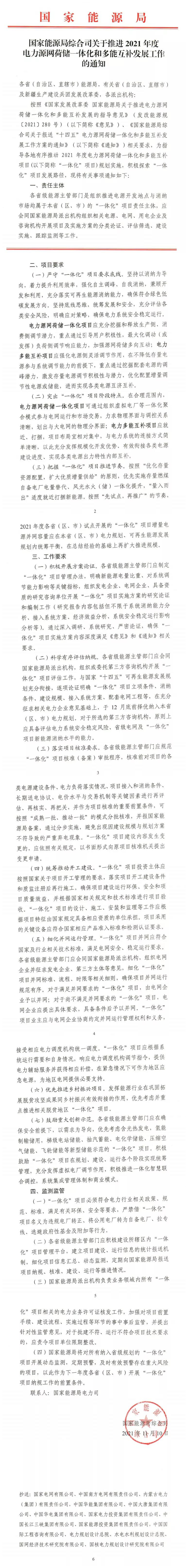 11月10日,国家能源局综合司《关于推进2021年度电力源网荷储一体化和多能互补发展工作的通知》。文件提出:按照“优化存量、资源配置,扩大优质增量供给”的原则,优先实施存量燃煤自备电厂电量替代、风光水火(储)一体化提升,“量入而出”适度就近打捆新能源。