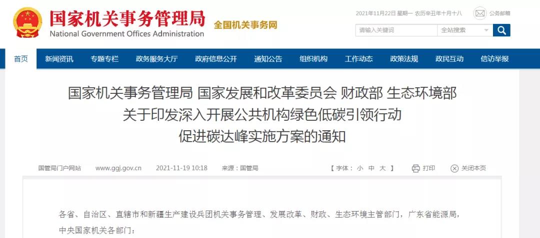 国家机关事务管理局 国家发展和改革委员会 财政部 生态环境部关于印发深入开展公共机构绿色低碳引领行动促进碳达峰实施方案的通知