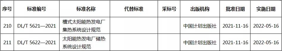 近日,国家能源局发布2021年第5号公告。公告批准发布《地热井井身结构设计方法》等326项能源行业标准、《Code for Seismic Design of Hydraulic Structures of Hyower Project》等19项能源行业标准外文版、《水电工程水工建筑物抗震设计规范》等3项能源行业标准修改通知单,其中包含《槽式太阳能热发电厂集热系统设计规范》和《太阳能热发电厂储热系统设计规范》两项光热发电标准。