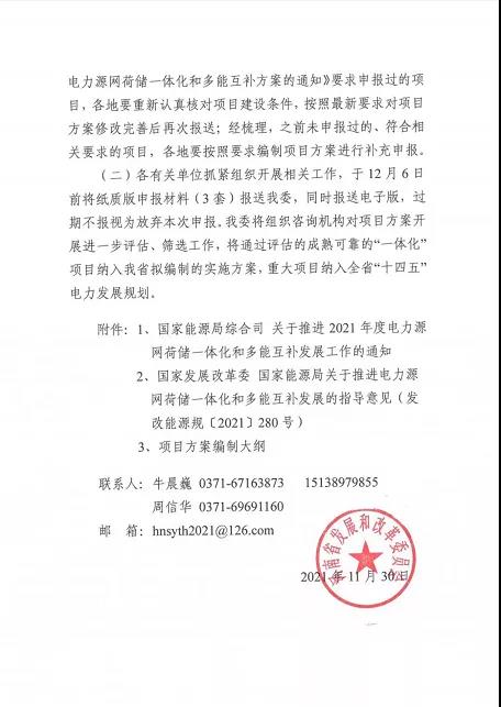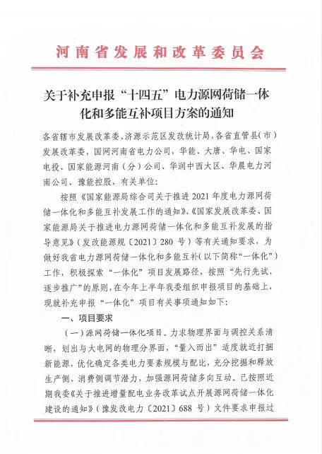 11月30日,河南省发改委发布了《关于补充申报“十四五”电力源网荷储一体化和多能互补项目方案》的通知。按照“先行先试、逐步推广”的原则,在今年上半年河南发改委组织申报项目的基础上,再次补充申报“一体化”项目。