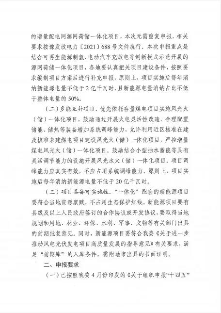 对于源网荷储一体化项目,本次补充申报重点结合可再生能源制氢、电动汽车充放电等创新模式示范开展的源网荷储一体化项目,各地要认真把关项目建设条件,按照要求编制项目方案后进行补充申报,原则上,项目实施后每年消纳新能源电量不低于2亿千瓦时,且新能源电量消纳占比不低于整体电量的50%。