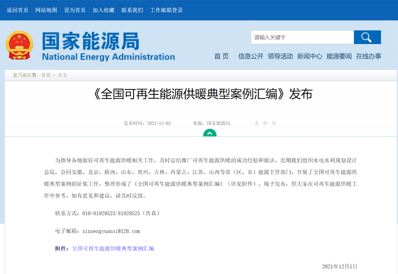 近日,国家能源局发布《全国可再生能源供暖典型案例汇编》。