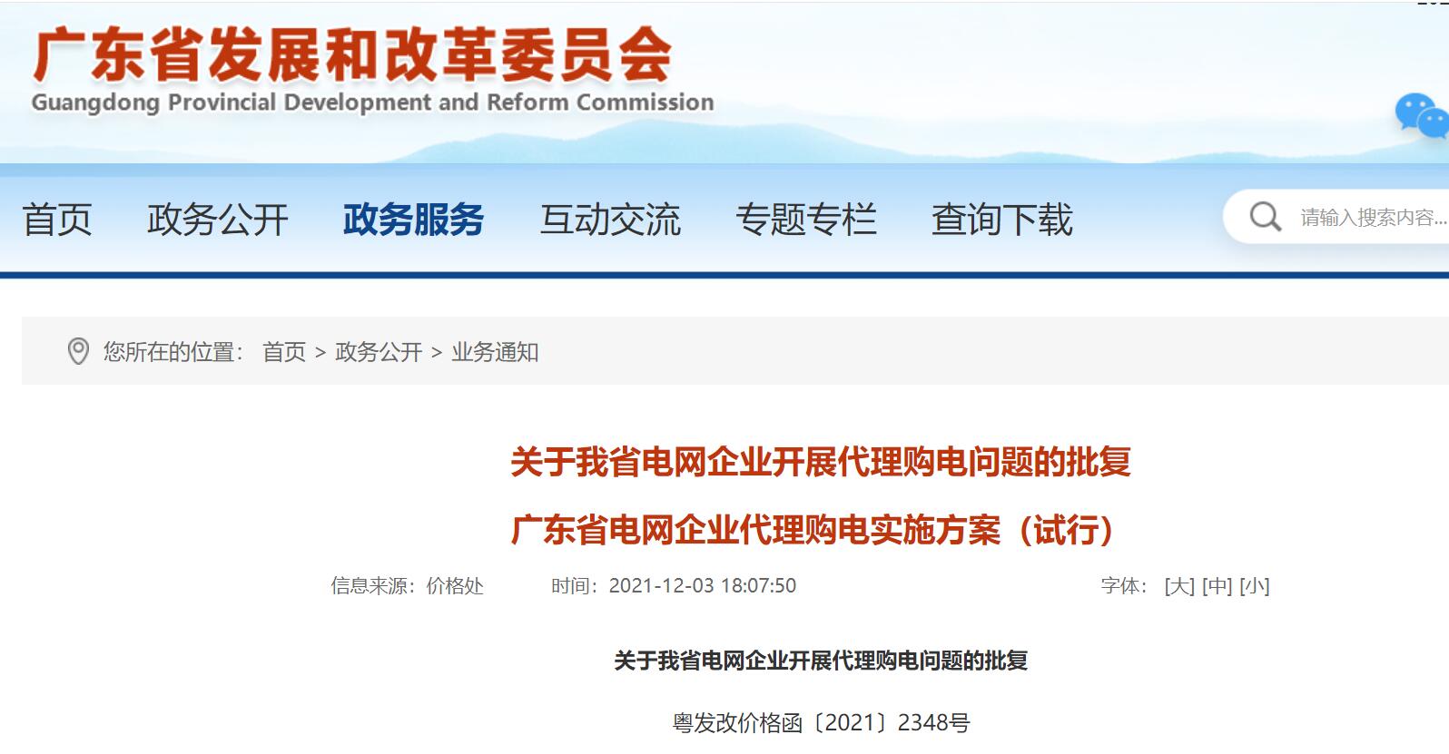 12月1日,广东省发改委批复同意执行《广东省电网企业代理购电实施方案(试行)》。该方案自今年12月1日起实施。