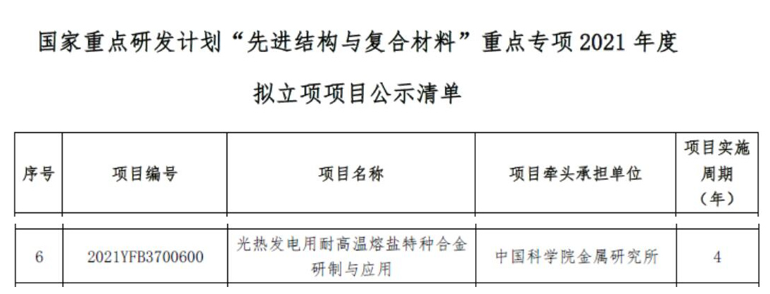 12月13日,科技部高技术研究发展中心发布《关于国家重点研发计划“先进结构与复合材料”重点专项2021年度项目安排公示的通知》,对“先进结构与复合材料”重点专项2021年度拟立项项目信息进行公示。公示时间为2021年12月13日至2021年12月17日。其中包括《光热发电用耐高温熔盐特种合金研制与应用》,该项目牵头承担单位为中国科学院金属研究所,实施周期4年。