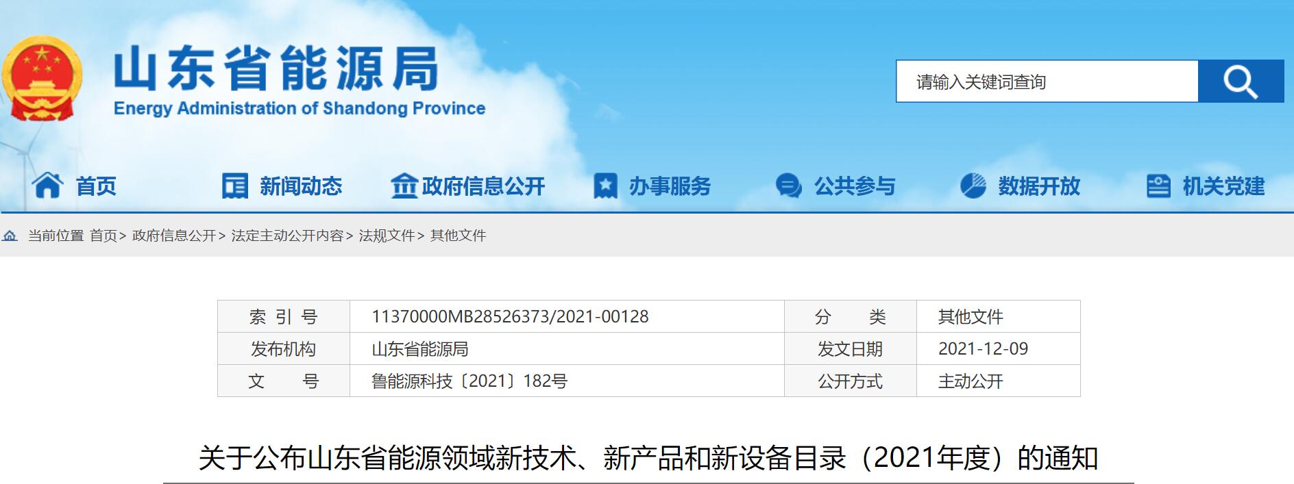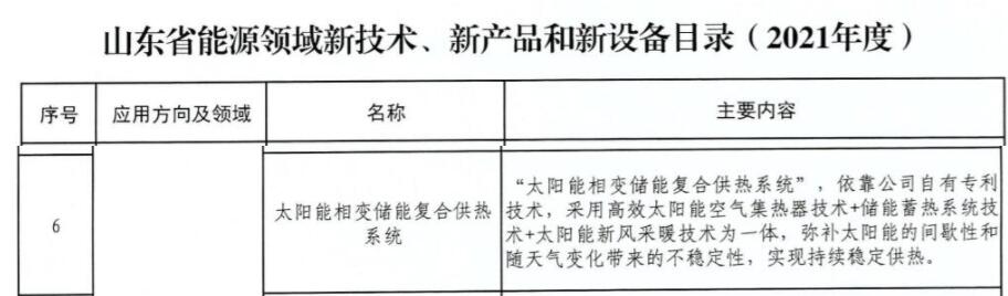 12月10日,山东省能源发布《关于公布山东省能源领域新技术、新产品和新设备目录(2021年度)的通知》(鲁能源科技〔2021〕182号),确定了48项能源领域技术、新产品和新设备,为能源领域绿色低碳转型提供技术支撑,其中太阳能相变储能复合供热系统入围。