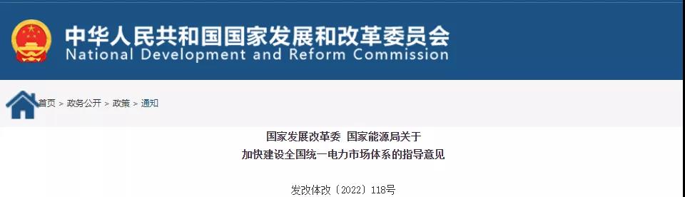 国家发改委、国家能源局1月28日发布《关于加快建设全国统一电力市场体系的指导意见》(发改体改〔2022〕118号)。