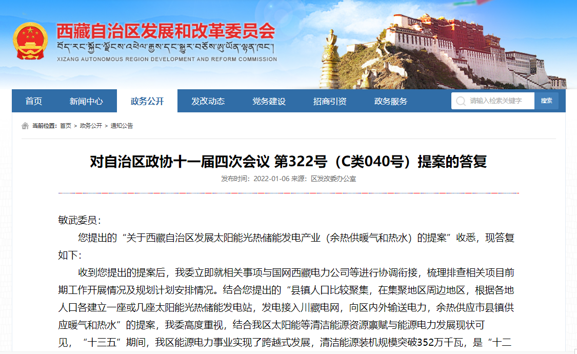 您提出的“关于西藏自治区发展太阳能光热储能发电产业(余热供暖气和热水)的提案”收悉,现答复如下: